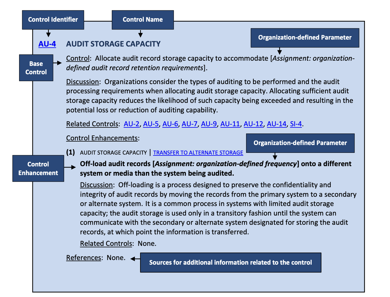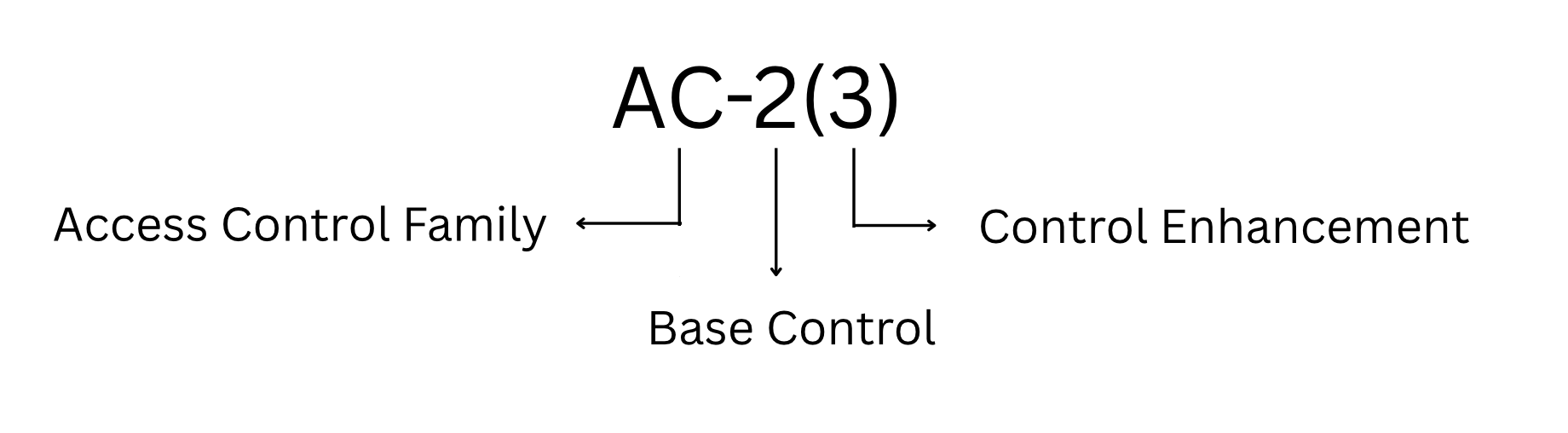 Each family uses a consistent two-letter prefix for its controls. Access Control controls, for example, are labeled AC-1, AC-2, AC-3, and so on. Audit and Accountability controls, on the other hand, begin with AU. Ultimately, this naming convention makes it easier to identify which family any given control belongs to at a glance.