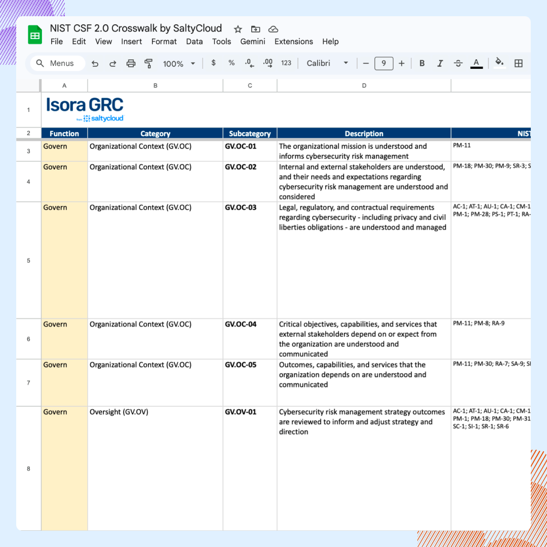 Map all 106 NIST CSF 2.0 Subcategories to controls in NIST 800-53, 800-171, ISO 27001, CIS v8, and SCF. See what your existing security program already covers before doing any new work.